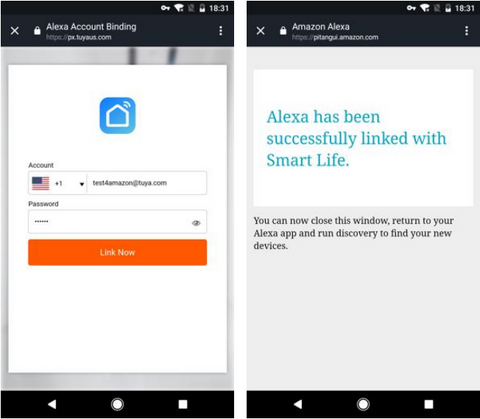 - Vi estos redirektita al la konta ligilo-paĝo. Tajpu vian konton kaj pasvorton de Smart Life, ne forgesu elekti la landon/regionon al kiu apartenas via konto. Tiam frapeti "Ligi Nun" por ligi vian Smart Life-konton. La lando/regiono, la konto kaj la pasvorto devas kongrui kun la ĝusta enhavo en Paŝo 2.2 kiam vi registris la konton. Kiam "Alexa estis sukcese ligita kun Smart Life" aperas, frapetu ✘ en la supra maldekstra angulo.