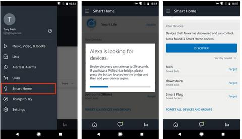 Echo bezonas malkovri viajn inteligentajn aparatojn antaŭ ol ĝi regas ilin. Vi povas diri "Alexa, malkovru aparatojn" al Echo. Echo malkovros aparatojn kiuj jam estis aldonitaj en la programo Smart Life. Vi ankaŭ povas frapeti "Malkovru" por malkovri la inteligentajn aparatojn. Malkovritaj aparatoj estos montritaj en la listo.