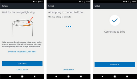 - Longe premu la punktobutonon sur la supro de via Echo-aparato ĝis la oranĝa lumo aperos, tiam premu "DaŭRU". Kiam via telefono estas konektita al Echo, klaku "DaŭRU"