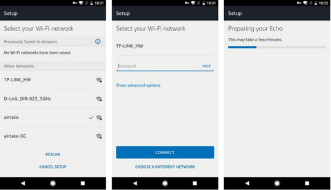 - Elektu Wi-Fi por lasi Echo havi la aliron al la interreto. Tajpu la pasvorton de Wi-Fi, tiam frapeti "Konekti". Eĥo povas daŭri plurajn minutojn por konekti la reton.