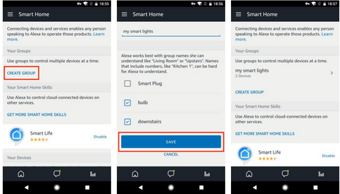 Vi ankaŭ povas agordi grupojn en Alexa-aplikaĵo. Frapu "KREU GRUPO", donu al via grupo nomon kiel "Miaj inteligentaj lumoj", elektu aparatojn por aldoni ilin en ĉi tiu grupo, tiam frapeti "SAVE".